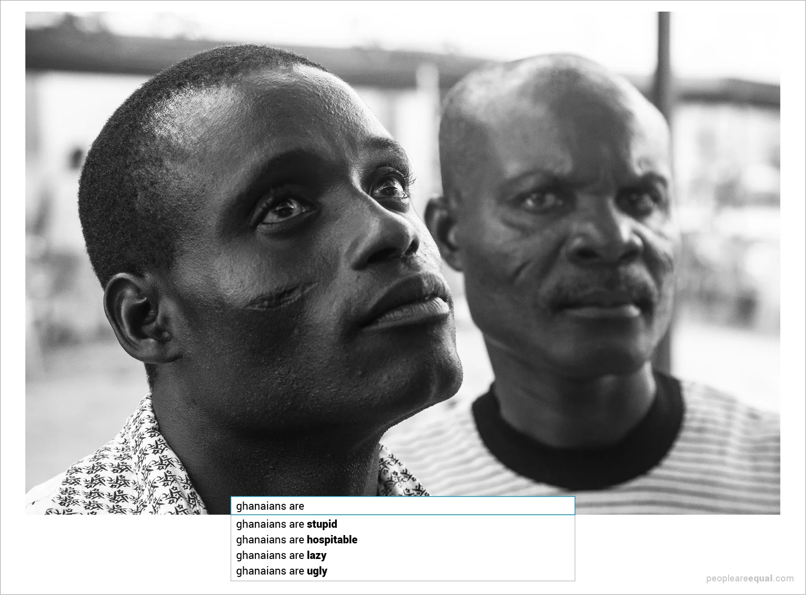 Google's auto-complete feature gives suggestions based on the most frequently performed searches. It’s curious to find out that, when we search for any nationality on it, most of the results is hatred and prejudices. Based on this, me and Linus Oura developed the project People Are Equal, that confronts the global opinion of each country to a real person of the same nationality. The site already has more than 60 pictures published by photographers from countries like Brazil, USA, South Korea, Poland, and Russia.